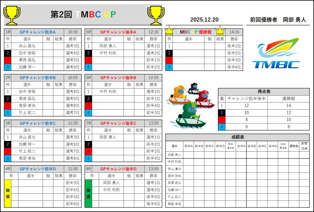 ボートレース場で行われるK400公式レースや、クラブ員同士の模擬レースの開催情報です。